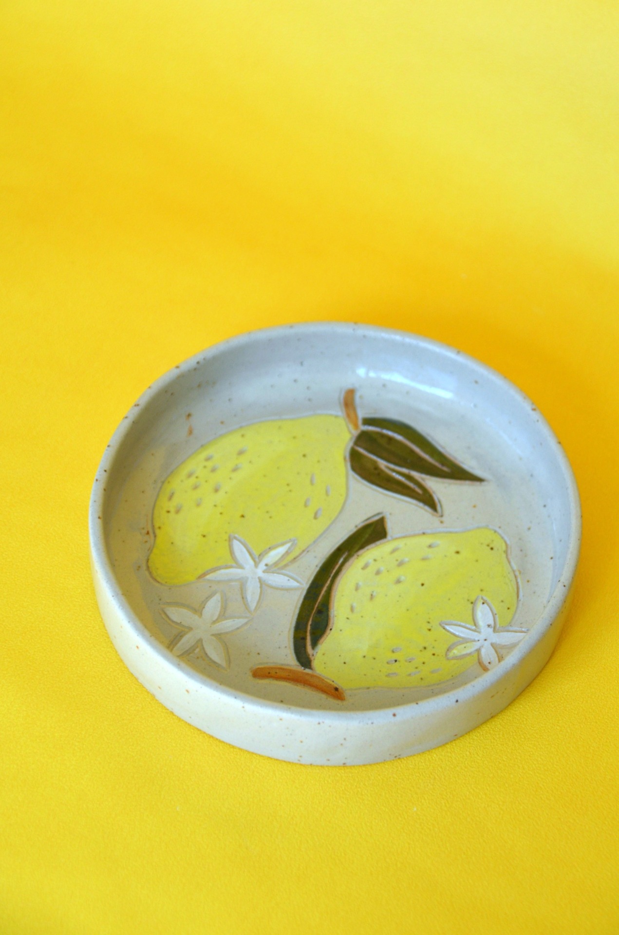 Täysin käsityönä Suomessa valmistettu, käsin koristeltu Sitruuna-tarjoilulautanen.